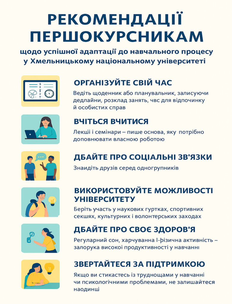 Початок студентського життя – це завжди важливий і водночас непростий етап у житті кожного першокурсника. Перехід від шкільної системи до університетської освіти супроводжується новими вимогами, зміною оточення та підвищеною відповідальністю. Щоб цей період пройшов легко та результативно, пропонуємо кілька рекомендацій.